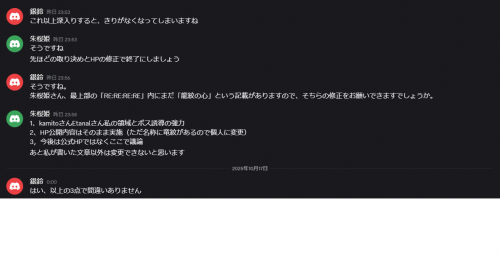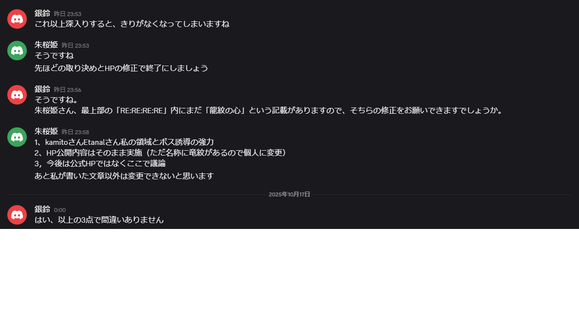 以下、朱桜姫とEtanalさんにて昨日決定した内容となり 皆様のは2番が該当します。 なお、この決定後に掲示番に記載をされているので 3の取り決めは反故されたのか真意は確認をいたします 皆様には混乱を生じさせ」、大変申し訳ありません。